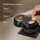 • Para rellenar: engancha los dedos alrededor de los dos salientes de los laterales del frasco y extrae suavemente el recipiente vacío. Inserta el recipiente de la recarga, empujándolo con firmeza en el interior del frasco. Retira el precinto de frescura y vuelve a tapar el recipiente. Desecha el recipiente vacío.